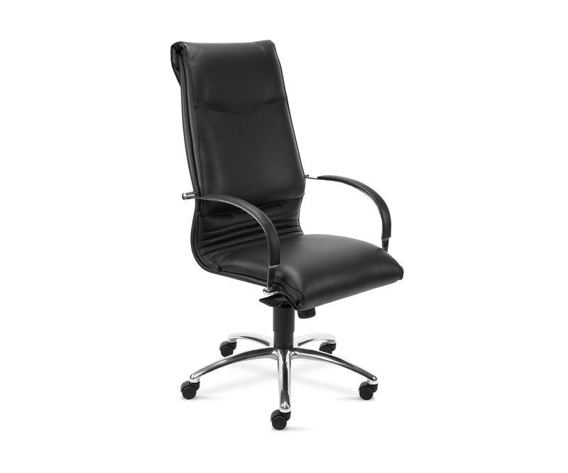 Fotoliu managerial de birou cu scoica sezut si spatar tapitate cu piele ecologica rezistenta la uz intens. Spatarul este inalt, cu rol de tetiera si are forma ergonomica si sustine pentru spatele utilizatorului o pozitie corecta la masa de lucru pentru timp indelungat. Bratele au prindere metalica cromata si paduri tapitate moi. Baza in forma de stea este metalica, aluminiu polisat cu efect de oglinda, cu rotile pentru podea dura sau pentru mocheta.