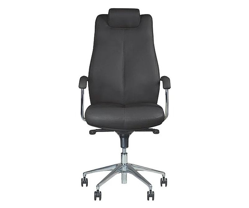 Scaun directorial confortabil cu sezut si spatar inalt cu tetiera fixa, tapitate integral cu piele ecologica rezistenta la uz intens. Bratelele metalice sunt fixe si au paduri moi. Scaunul are baza polisata cu efect cromat, in forma de stea cu roti fi65mm pentru podele cu mocheta sau parchet.