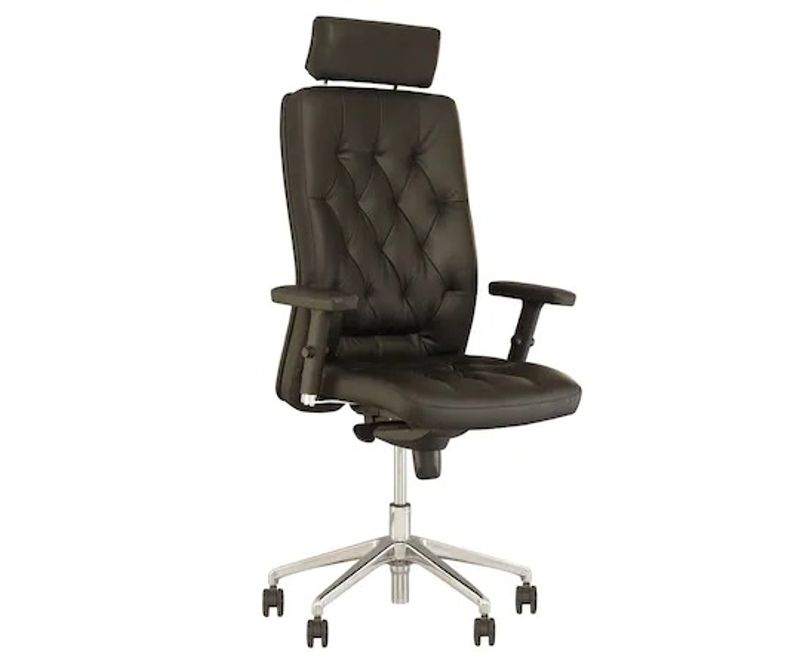 Este un scaun directorial confortabil cu sezut lat si spatar cu tetiera fixa, tapitate integral cu piele ecologica rezistenta la uz intens. Spatarul se poate ajusta pe inaltime prin functia Up&Down. Bratelele metalice sunt ajustabile 2D si au paduri moi. Scaunul are baza polisata cu efect cromat, in forma de stea si este dotat cu roti fi65mm pentru podele cu mocheta sau parchet. Mecanismul Syncron permite utilizatorului un balans relaxant, sezutul si spatarul se inclina in sincron in rata 2:1. Unghiul de inclinare al spatarului este de 20°, sincronizat cu unghiul de inclinare al sezutului de 11°, iar forta de balans este ajustabila printr-un buton rotativ.
