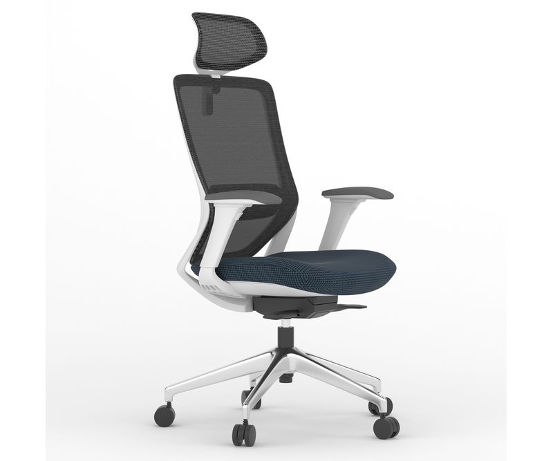 Scaun de birou cu spătar mesh, cadru light grey, baza aluminiu, brațe 4D, suport lombar reglabil, tetiera reglabilă, mecanism syncron autoreglabil, translație șezut. Certificări: EN 1335 și BIFMA X5.1
