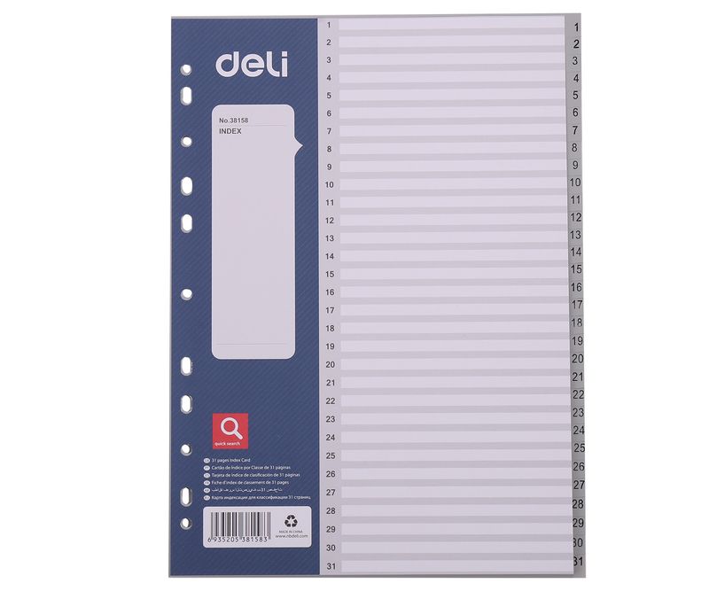 Index din polipropilena (PP) gri, durabil, destinat organizarii si cautarii mai eficiente. Pagina de sumar pentru descrierea continutului. Prevazut cu 11 perforatii pentru arhivare in bibliorafturi sau caiete mecanice. Format: A4. Dimensiuni: 225 x 297 mm. Tip index: 1-31.