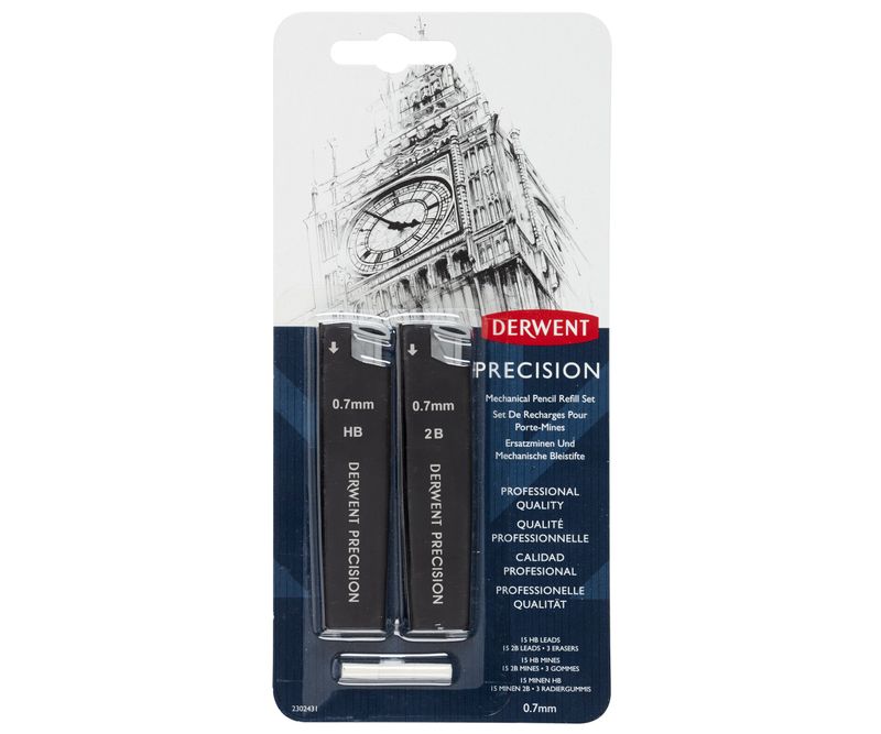 Precizia este ideala atat pentru desenatori, cat si pentru profesionistii in desen tehnic; ne mandrim cu un creion metalic premium care a fost proiectat pentru aderenta si echilibrul optim. Disponibil si in dimensiunea de 0,5 cu grade de grafit HB si 2B. Creioanele mecanice de precizie Derwent includ o radiera incorporata sub capacul butonului și butucul retractabil le face sigure la buzunar. Precizia ofera o asezare lina a grafitului, potrivita pentru detalii fine si tehnici de umbrire.