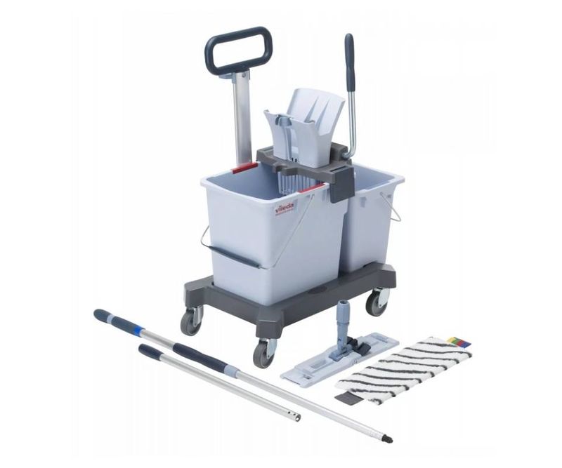 • Kitul Ready To Go include doua galeti cu storcator, sasiu, maner universal extensibil Vileda, cadru UltraSpeed Pro de 16 inchi si un mop UltraSpeed Trio.