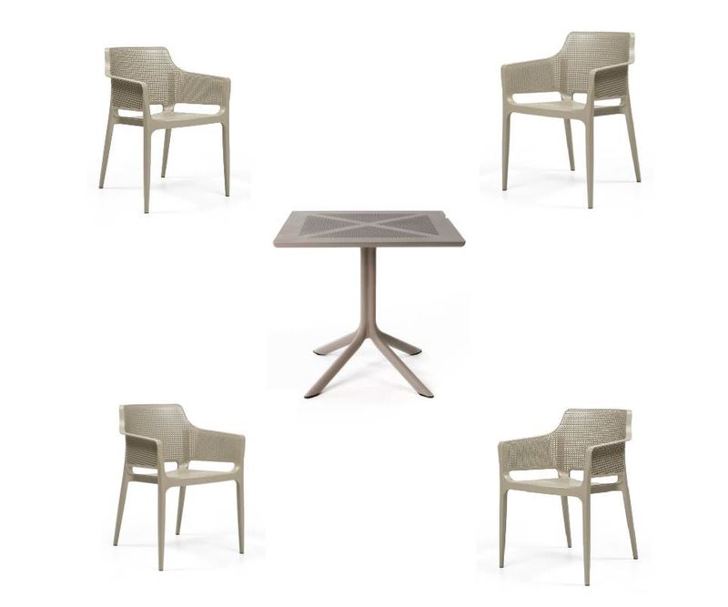 Setul conține: 4 scaune Like + 1 masă Novussi Atlantic 80 cappuccino.