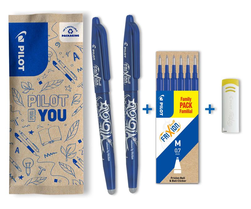 Set flow pack 2 rollere Pilot Frixion Ball + set 6 rezerve 0.7 mm albastru + radiera Frixion