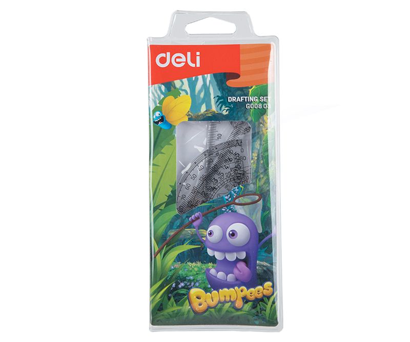 Set pentru geometrie, din material rezistent. Lupa de marire la capatul riglei. Setul contine rigla de 15cm, echere de 8cm cu deschidere 30/60/90grade, respectiv 6cm deschidere 45/45/90grade, raportor 9cm.
