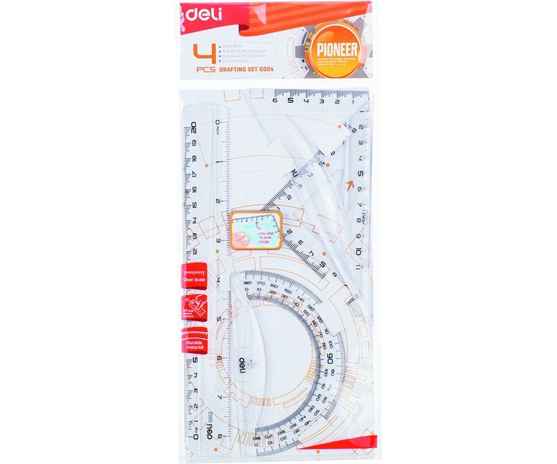 Set pentru geometrie, din material rezistent la rupere, usor de ridicat de pe birou. Setul contine rigla de 20cm, echere 11cm cu deschidere 30/60/90grade, respectiv 8cm deschidere 45/45/90grade, raportor 12cm.