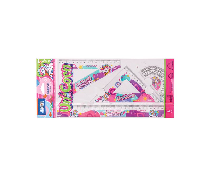 Include riglă de 30 cm, echer de 45°, echer de 30° și raportor de 180°