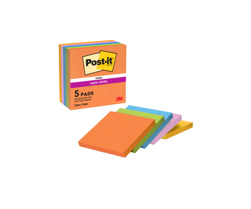Post-it-urile® Super Sticky Notes au de 2 ori mai multă putere de lipire (față de gama Post-it® standard). Sunt foarte puternice, extrem de versatile și vin într-o varietate de culori vibrante pentru a scoate în evidență orice informație sau mesaj.