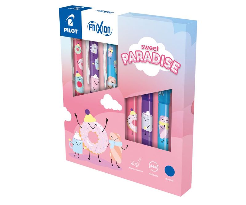 Set Pilot Frixion Fancy – 6 rollere: 3 Clicker + 3 cu capac, culori roz, bleu și violet – cerneală albastră, design vesel cu personaje colorate