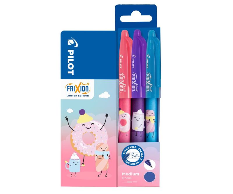 Set Pilot Frixion Ball Fancy 0.7 mm X 3 - roz + bleu + violet - cerneala albastra, design vesel cu personaje colorate