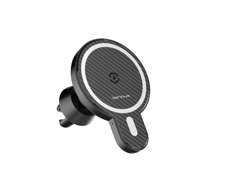 Suport Auto Telefon Serioux, cu incarcare Wireless 15W, compatibil MagSafe, prindere grila ventilatie, Intrare: 5V=2A 9V=2A, Iesire: 5W 7.5W 10W 15W(Max), Dimensiuni: 61*84*71mm
