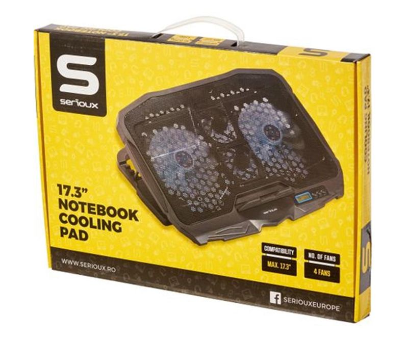 Cooling pad Serioux, SRXNCP025, Dimensiuni: 390*280*28mm, Compatibilitate maxima laptop: 17.3 inch, Numar ventilatoare: 4, Dimensiune ventilator: 2 x 125*125*15mm / 2 x 70*70*15mm, Nivel zgomot: 15-20dB, Flux aer: 56-75CFM, Tensiune alimentare: DC 5V, Viteza rotatie maxima: 1200 RPM, Display LCD, 2 porturi USB, Iluminare LED: Albastru, Dimensiune cablu USB: 55cm, Inaltime ajustabila, Greutate neta: 0.700g