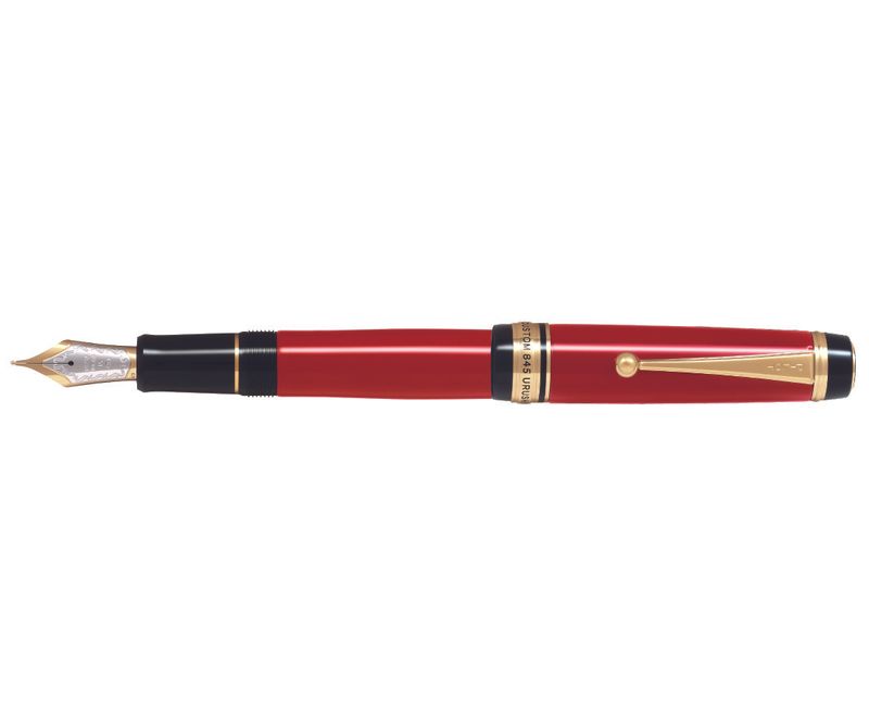 Stiloul stilograf Pilot Custom 845 este fabricat din rasina si este acoperit cu lac negru Urushi cu finisaj acoperit cu aur si cu penita de 18K .