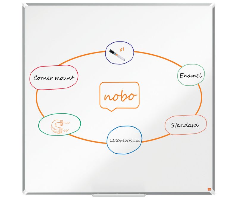 Tablă NOBO Premium Plus, oțel, magnetică, cu o ramă modernă și elegantă din aluminiu. Montată prin colțuri, include o tăviță mare pentru accesorii de scris și șters. Suprafața din oțel vopsit oferă un nivel de rezistență ridicat pentru o ștergere cât mai ușoară, fiind potrivită pentru uz frecvent. Dimensiuni: 1200x1200 mm.