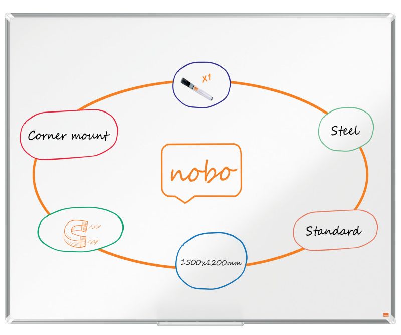 Tablă NOBO Premium Plus, oțel, magnetică, cu o ramă modernă și elegantă din aluminiu. Montată prin colțuri, include o tăviță mare pentru accesorii de scris și șters. Suprafața din oțel vopsit oferă un nivel de rezistență ridicat pentru o ștergere cât mai ușoară, fiind potrivită pentru uz frecvent. Dimensiuni: 1500x1200 mm
