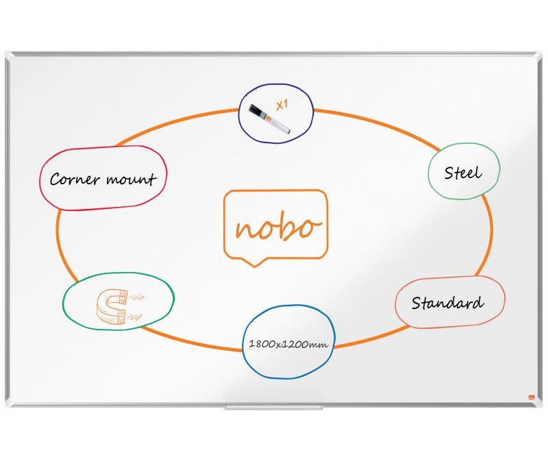 Tablă NOBO Premium Plus, oțel, magnetică, cu o ramă modernă și elegantă din aluminiu. Montată prin colțuri, include o tăviță mare pentru accesorii de scris și șters. Suprafața din oțel vopsit oferă un nivel de rezistență ridicat pentru o ștergere cât mai ușoară, fiind potrivită pentru uz frecvent. Dimensiuni: 1800x1200 mm
