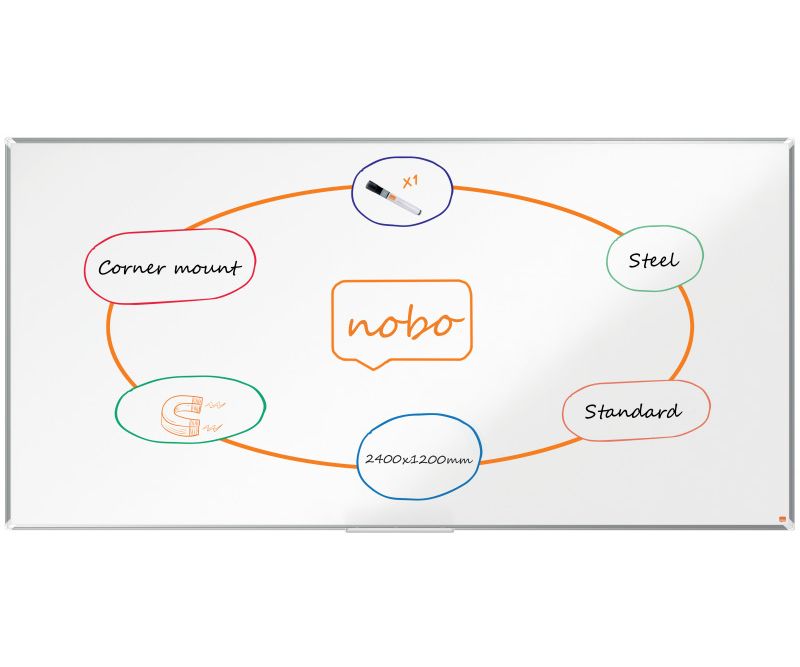 Tablă NOBO Premium Plus, oțel, magnetică, cu o ramă modernă și elegantă din aluminiu. Montată prin colțuri, include o tăviță mare pentru accesorii de scris și șters. Suprafața din oțel vopsit oferă un nivel de rezistență ridicat pentru o ștergere cât mai ușoară, fiind potrivită pentru uz frecvent. Dimensiuni: 2400x1200 mm