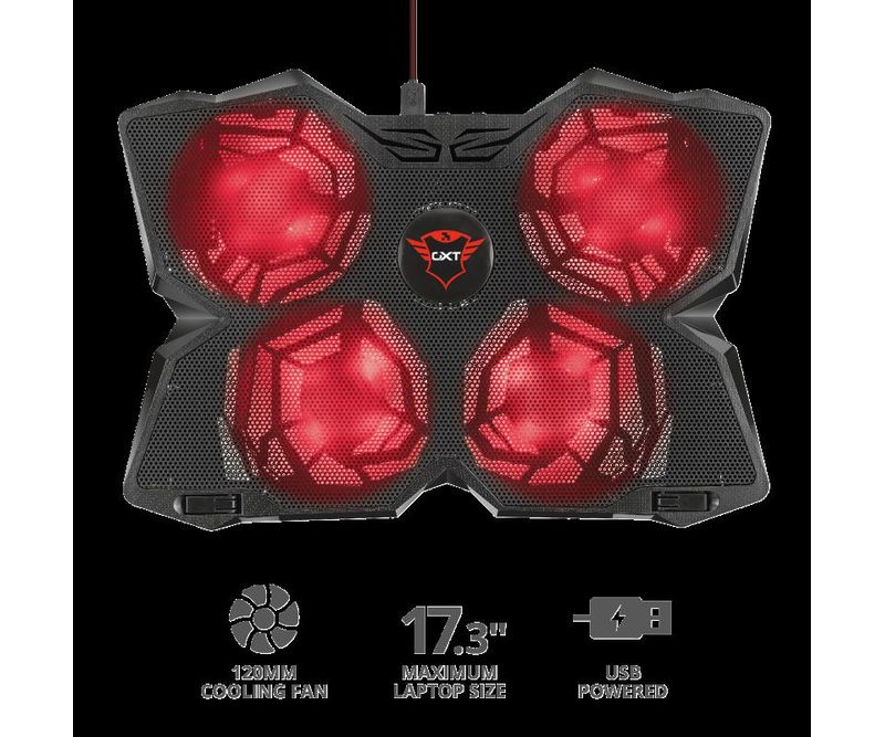 Cooler laptop Trust GXT 278 Yozu, 4 ventilatoare, viteza rotatie 1200 RPM, lumini LED rosii, pentru laptopuri de pana la 17.3 , greutate maxima 5 kg, negru