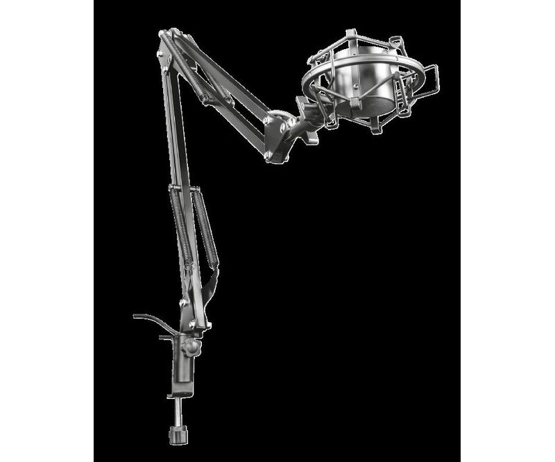 Brat Microfon Trust GXT 253 Emita Streaming Microphone Arm Specifications General Application Desktop Height of main product (in mm) 417 mm Width of main product (in mm) 114 mm Depth of main product (in mm) 39 mm Total weight 588 g Connectivity Connector type USB Features Noise reduction no Mount Type of anti-vibration measures shock mount Type of stand table arm clamp Compatibility Compatible Consoles no General compatibility Fits all commonly used microphones (5/8 screw adapter included) https://www.trust.com/en/product/22563-gxt-253-emita-streaming- microphone-arm