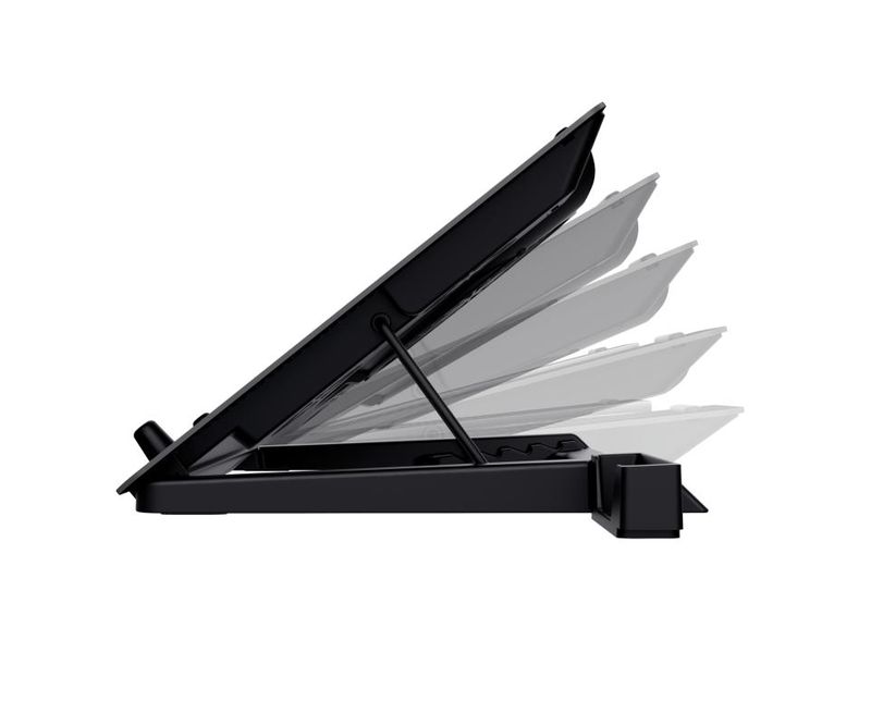 Stand racire Laptop Trust GXT 1125 Quno Laptop Cooling Stand Specifications General Max. laptop size 17 Max. weight 9.4 kg Max. lift height 19 cm Height adjustment (steps) 5 steps Fan included yes, 1x 130mm 4x50mm Height of main product (in mm) 50 mm Width of main product (in mm) 400 mm Depth of main product (in mm) 280 mm Total weight 1060 g Weight of main unit 1012 g Main material Aluminum Connectivity Cables included separate, 100cm Features Foldable no Anti-skid yes Lighting Lights yes LED colours Blue Characteristics Noise level (range) 45 dBA Rotation speed 800 RPM Air flow 70 CFM Bearing type Sleeve Number of fans 5 Fan size 130 mm Fan size (of fan 2, 3, 4, 5) 50 mm Input Power source USB