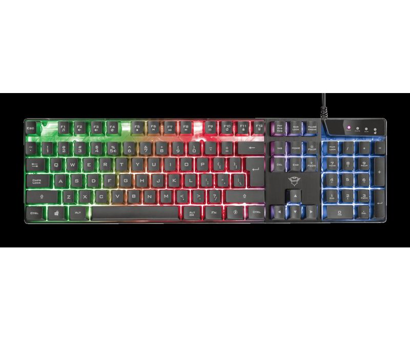 Tastatura Trust GXT 835 Azor Illuminated Gaming Keyboard Specifications General Key technology membrane Height of main product (in mm) 40 mm Width of main product (in mm) 438 mm Depth of main product (in mm) 125 mm Total weight 621 g Weight of main unit 589 g Full Size keyboard yes Ergonomic design no Connectivity Connection type wired Cable length main cable 180 cm Bluetooth no USB version 1.1 Connector type USB-A male Features Spill-proof no Silent keys no On-board memory no Wrist support no Software no Gaming Designed for gaming yes Game type FPS, MMO, MOBA, RPG, RTS Gaming mode yes Lighting Backlight yes Backlight colours Rainbow Key illumination no Characteristics Keyboard layout QWERTY Input Power source USB Power adapter Power adapter included no Compatibility Compatible Device Types laptop, pc, gaming console Compatible Consoles PS4, Xbox One Compatible Software Platforms Mac OS, Windows, Chrome OS