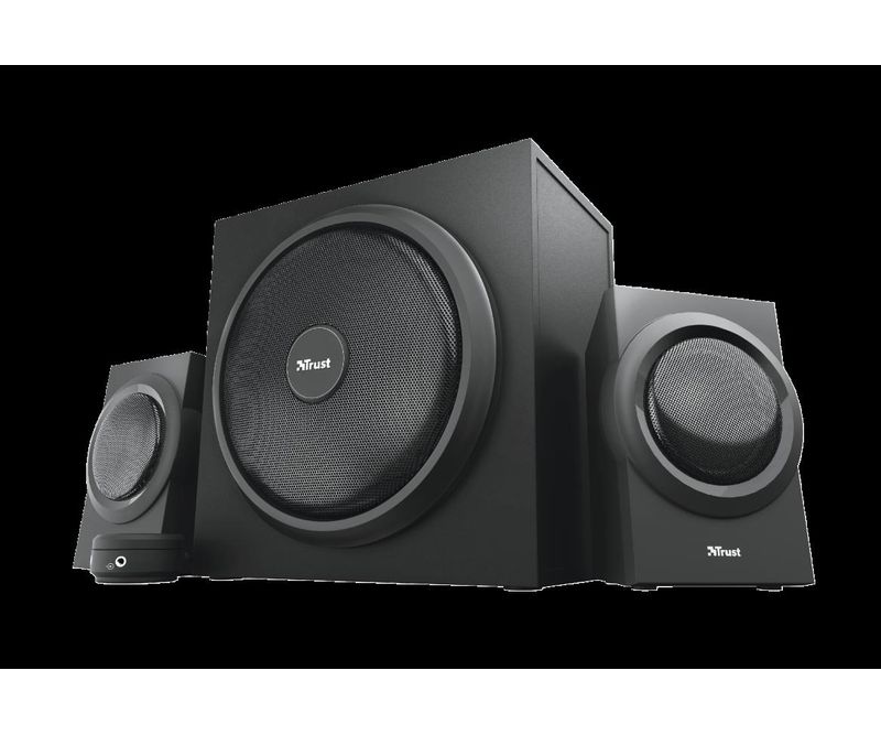 Sistem audio Trust Yuri 2.1 Speaker Set Specifications General Height of main product (in mm) 240 mm Width of main product (in mm) 180 mm Depth of main product (in mm) 240 mm Total weight 3720 g Weight of main unit 2220 g Connectivity Connection type wired Cable length power cable 150 cm Cable length audio cable 150 cm Cable length satellite cable 140 cm Bluetooth no Cable length subwoofer to remote cable 180 cm Cables included power cable,3.5mm audio cable Audio Driver units 3 Speaker impedance 4 Ohm Audio input 3.5 mm Input impedance 680 Ohm Audio output None Headphone connection yes Microphone built-in yes Microphone connection no Power output (peak) 120 W Power output (RMS) 60 W Power output - subwoofer (RMS) 30 W Power output - satellite (RMS) 15 W Frequency response 20 Hz - 20000 Hz Features NFC no Hands-free phone calls no Tripod mount no Accessories 3.5mm audio cable Power saving yes Lighting Lights no Protection Waterproof no Power Power cable detachable yes Input Power source wall socket Compatibility Compatible Consoles no Compatible Device Types pc, smartphone, laptop, tablet Control Controls volume Remote control wired Satellites Satellite Height (mm) 154 mm Satellite Width (mm) 115 mm Satellite Depth (mm) 75 mm Satellite Weight (gr) 350 gr Subwoofer Subwoofer Height (mm) 240 mm Subwoofer Width (mm) 180 mm Subwoofer Depth (mm) 180 mm Subwoofer Weight (gr) 2222 gr Remote Batteries for remote included no https://www.trust.com/en/product/23696-yuri-2-1-speaker-set