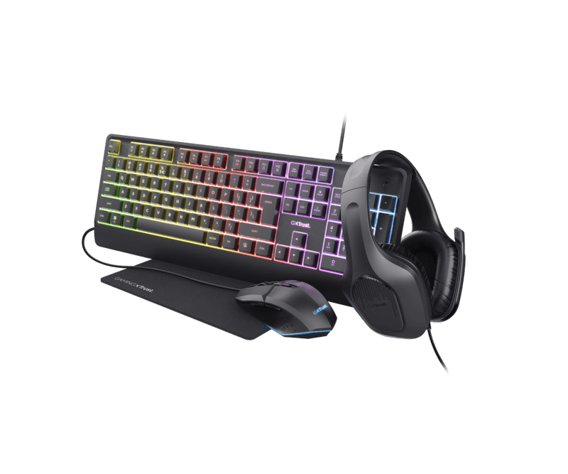 Kit Trust GXT 792 Quadrox 4-in-1, kitul contine: casti gaming, tastatura gaming, mouse gaming, mousepad, adaptor